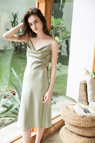 Be enchanted. A silky pistachio green midi slip dress featuring spaghetti straps and a cowl neckline. For all your après-midnight occasions.